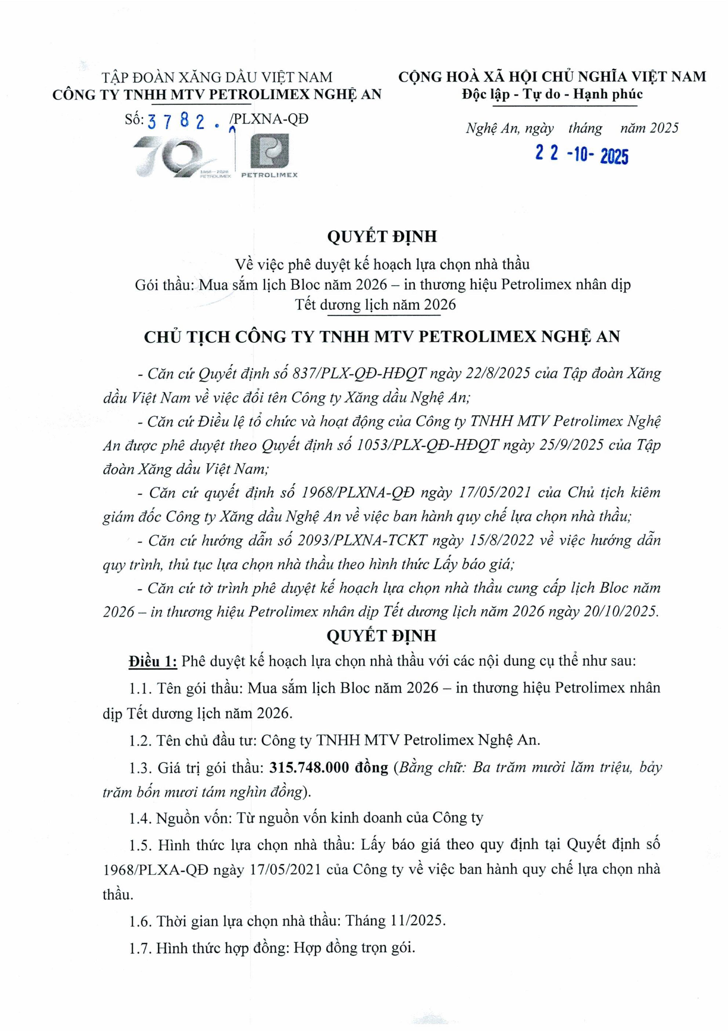 Kế hoạch lựa chọn nhà nhầu cung cấp lịch Bloc cực đại - in thương hiệu Petrolimex tặng khách hàng nhân dịp Tết Dương lịch 2026