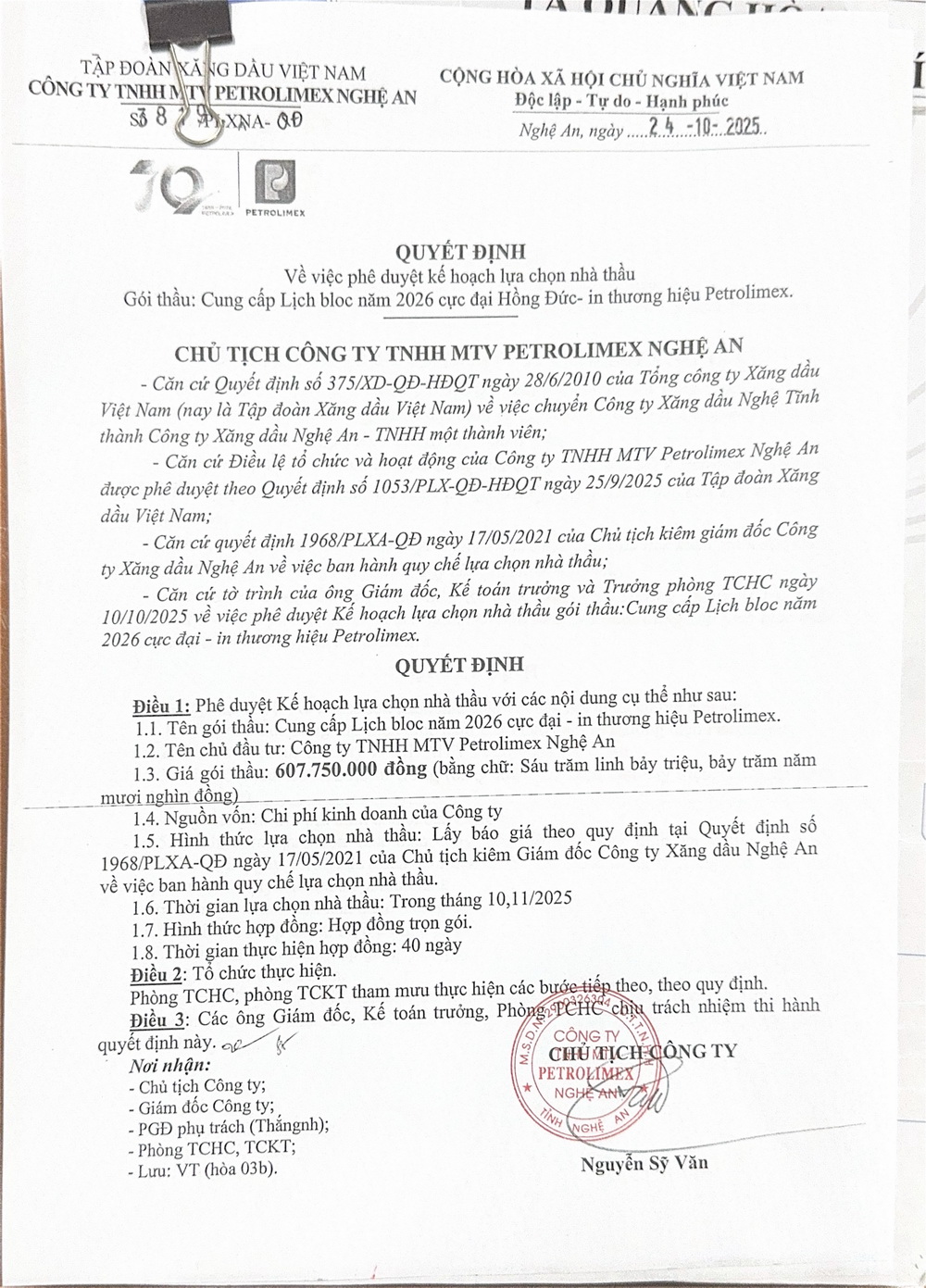 Kế hoạch lựa chọn nhà thầu, gói thầu: Cung cấp lịch bloc năm 2026 cực đại Hồng Đức in thương hiệu Petrolimex