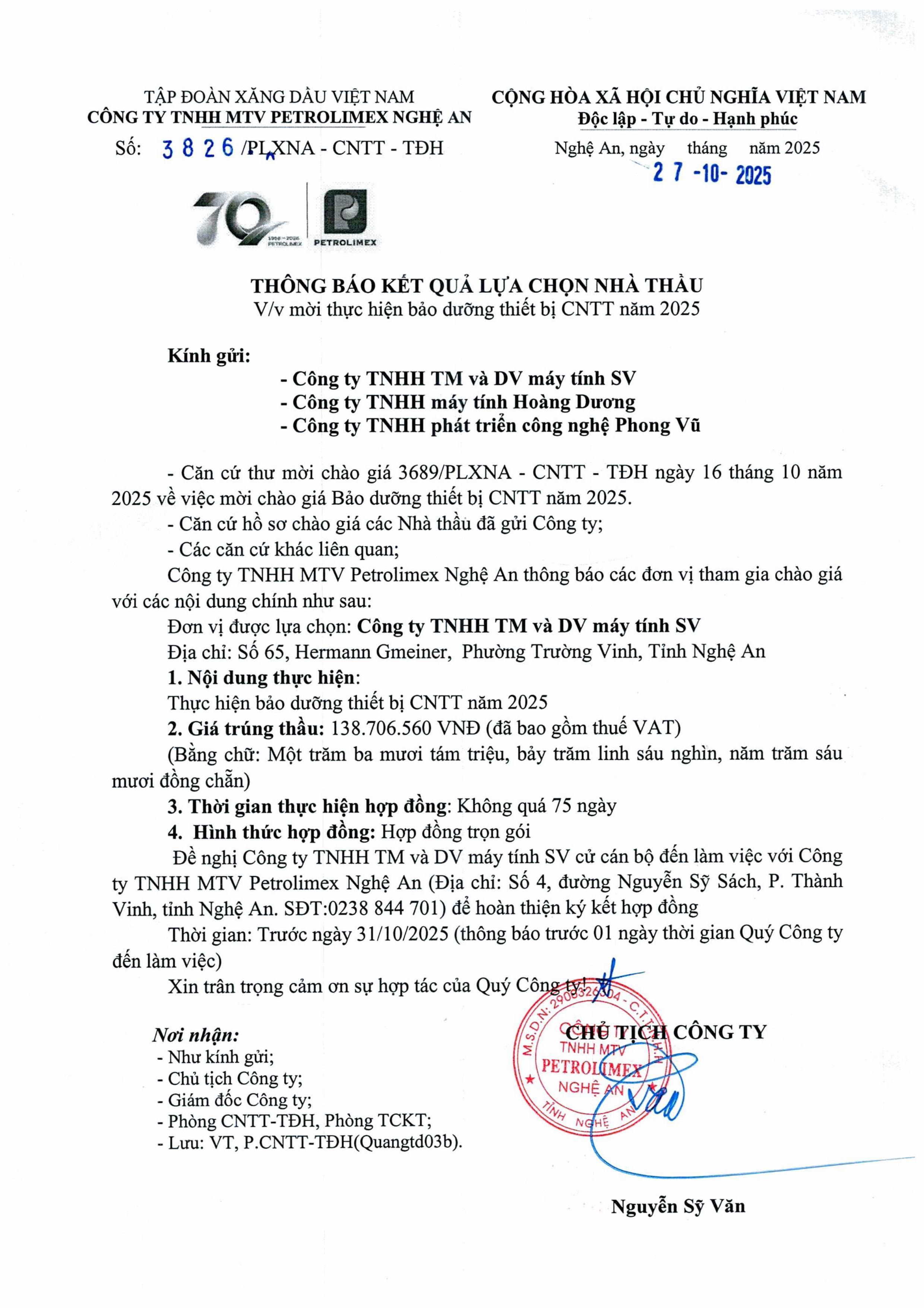 Thông báo kết quả lựa chọn nhà thầu, gói thầu: Mời thực hiện bảo dưỡng thiết bị CNTT năm 2025