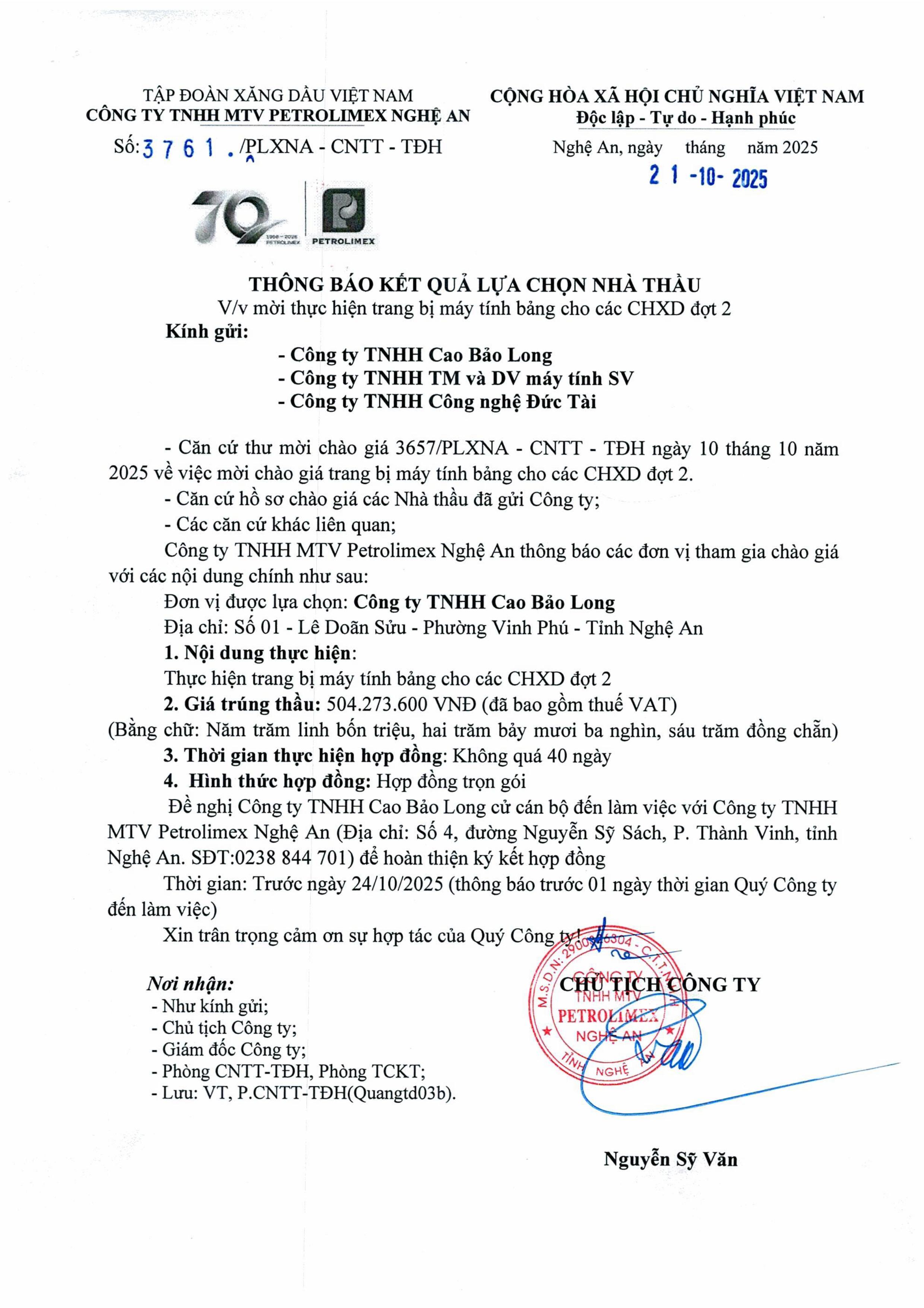 Thông báo kết quả lựa chọn nhà thầu, gói thầu: Mời thực hiện trang bị máy tính bảng cho các CHXD đợt 2