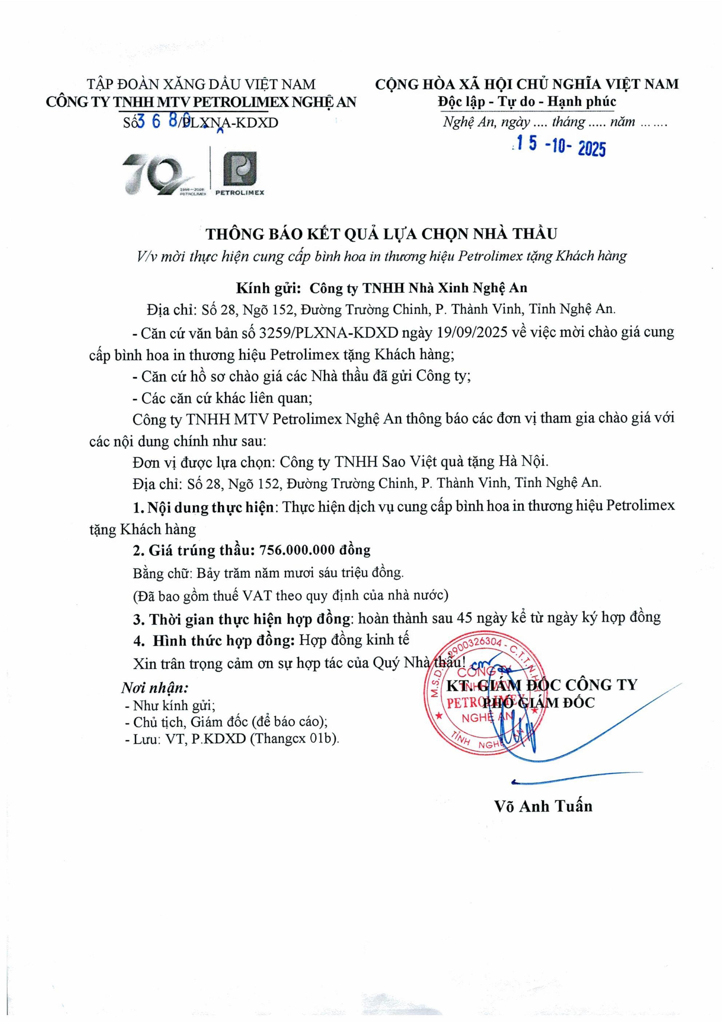 Thông báo kết quả lựa chọn nhà thầu, gói thầu: Thực hiện cung cấp bình hoa in thương hiệu petrolimex tặng khách hàng